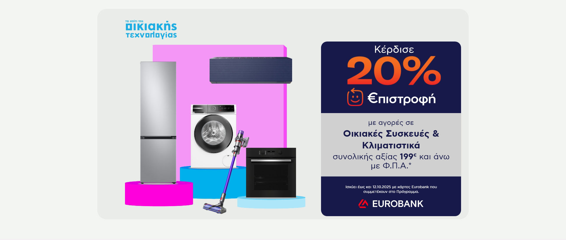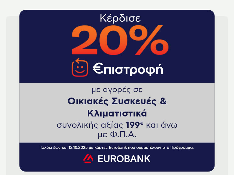 Στην παρούσα ενέργεια 20% €πιστροφή με πιστωτικές & χρεωστικές κάρτες Eurobank που συμμετέχουν στο Πρόγραμμα οικιακές συσκευές και κλιματιστικά συνολικής αξίας από 199€ και πάνω. Εξαιρούνται τα προϊόντα Apple & προϊόντα κατόπιν παραγγελίας.