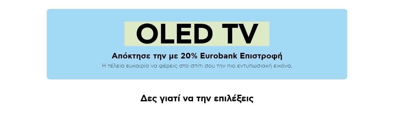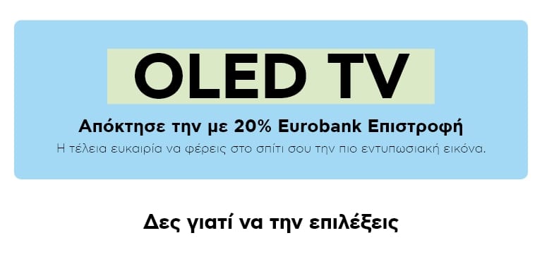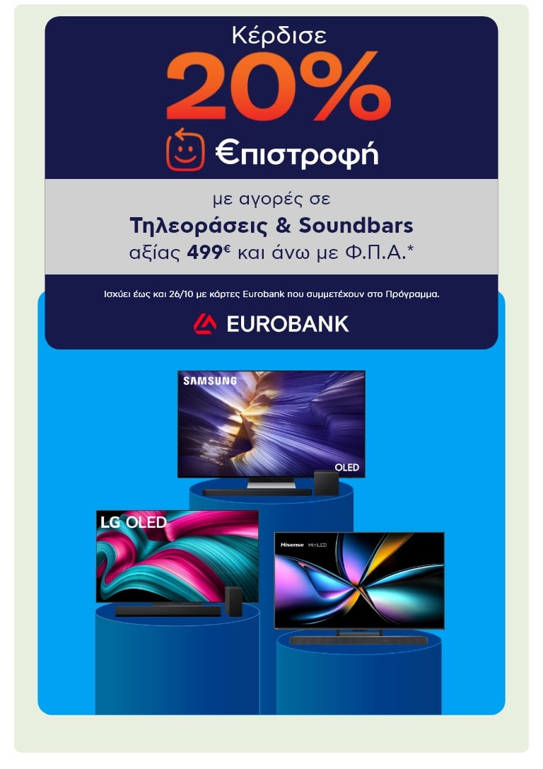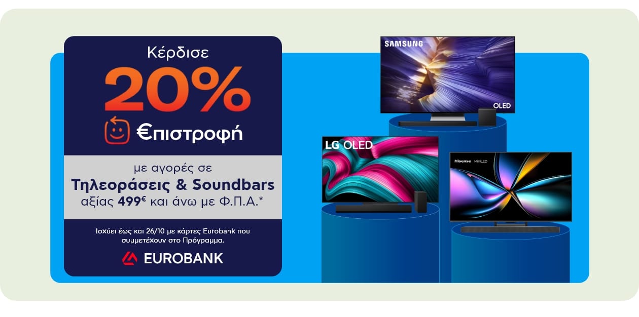 Στην παρούσα ενέργεια 20% €πιστροφή με πιστωτικές & χρεωστικές κάρτες Eurobank που συμμετέχουν στο Πρόγραμμα Τηλεοράσεις & Soundbars αξίας από 499€ και πάνω. Εξαιρούνται τα προϊόντα Stockhouse.